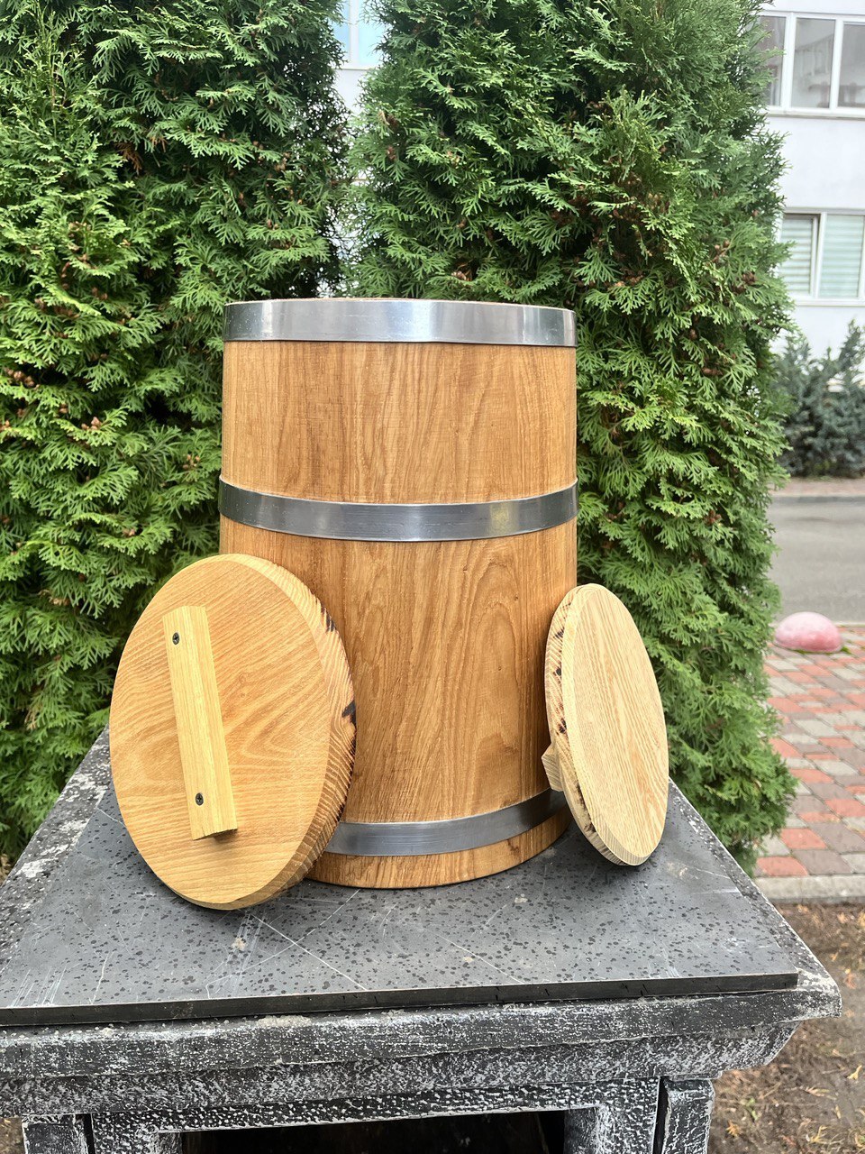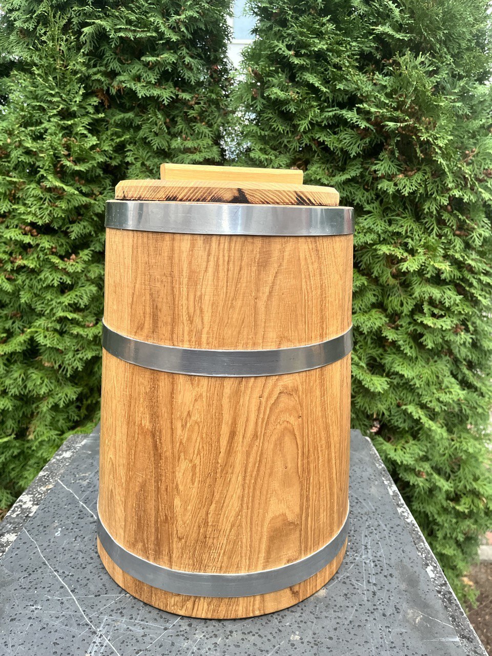 Дружина в цьому році захотіла заквасити помідори та капусту в дубових бочках. Попросила щоб купив. Довго не міг знайти гарного продавця і нарешті знайшов. Замовляв декілька разів, як постійному клієнту зробили знижку, що дуже приємно. Якістю бочок залишилися задоволені. Вони не течуть, дерево товсте, а обручі з нержавійки що є великим плюсом, так як в погребі не будуть ржавіти.